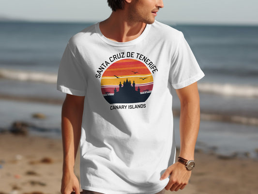 Retro Santa Cruz de Tenerife Grafik T-Shirt, Sonnenuntergangsdesign, Kanarische Inseln Silhouette, Vintage Sonnenuntergang Motiv