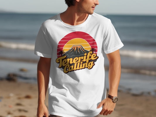 Retro Sonne und Berg Design T-Shirt, Teneriffa Calling Grafik T-Shirt, Vintage Insel Urlaub Sommerkleidung