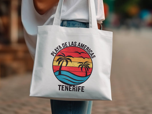Vintage Retro Strand Tasche Playa de las Americas Tenerife, Reisetasche mit Strandmotiv, Tropisches Palmen Design Tasche