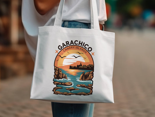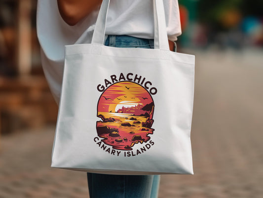 Retro Garachico Kanarischen Inseln Sonnenuntergang Tote Bag, Strandurlaub Tragetasche, Landschaft Illustration Tasche, Reise Zubehör